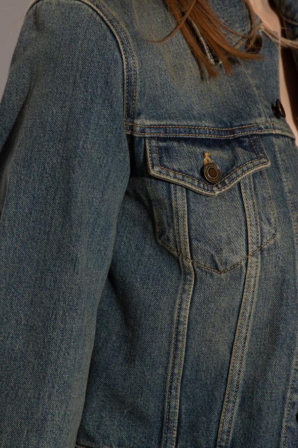 Blue denim jacket from Saint Laurent. Embellished with a vintage-effect, this style features button fastenings, two flapped button pockets and long sleeves.