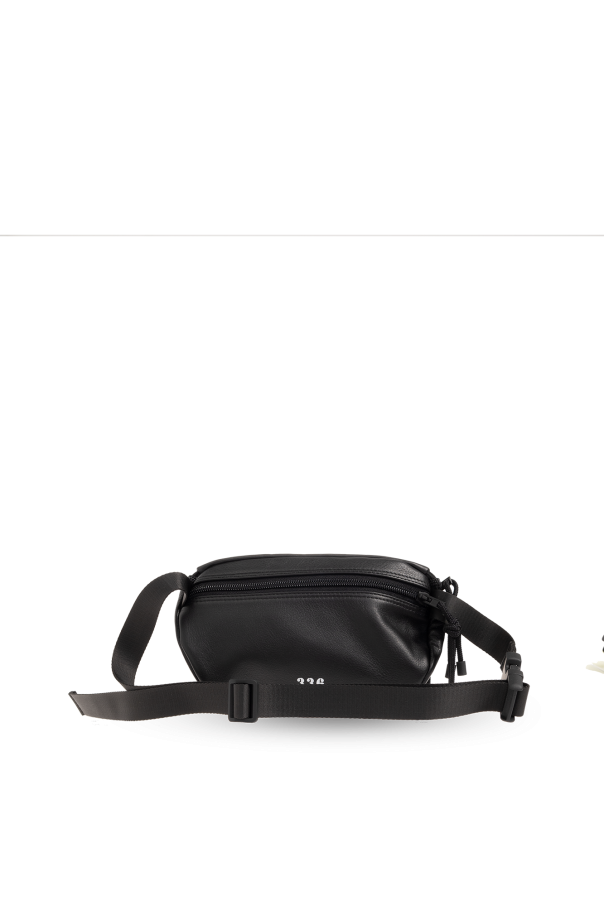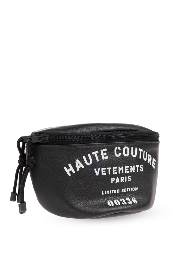 Black belt bag from VETEMENTS. Made of leather. Fastened with a two-way zip, this design features a white logo print, zipped back pocket, adjustable strap, one internal compartment and black metal hardware.