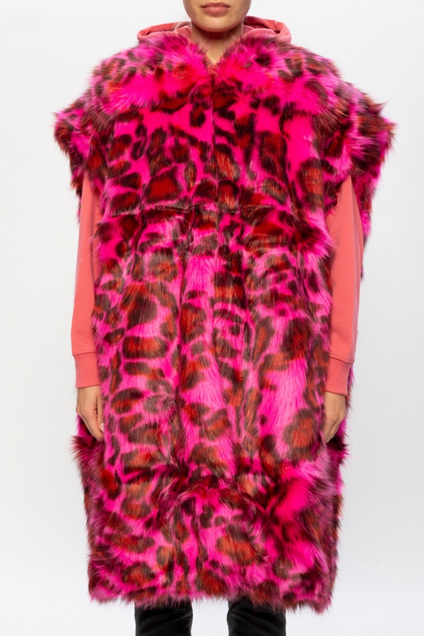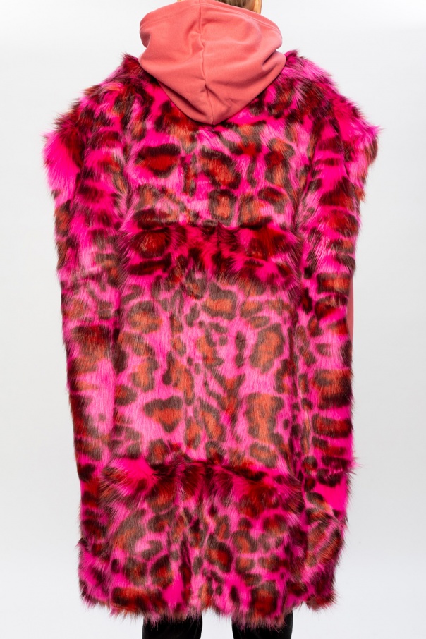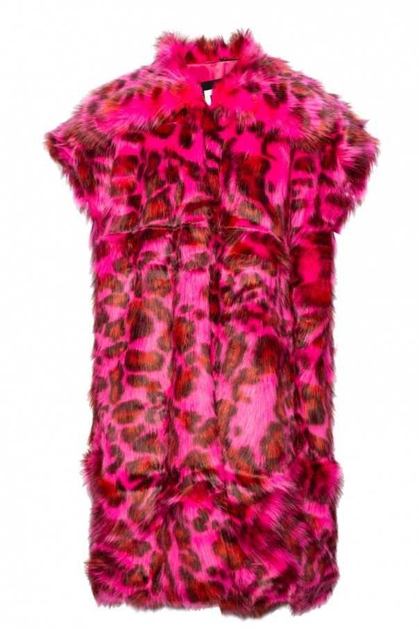 Pink, red and black vest from Diesel. Illustrated with leopard print, this sleeveless design was made of faux-fur and features hook & eye closures.