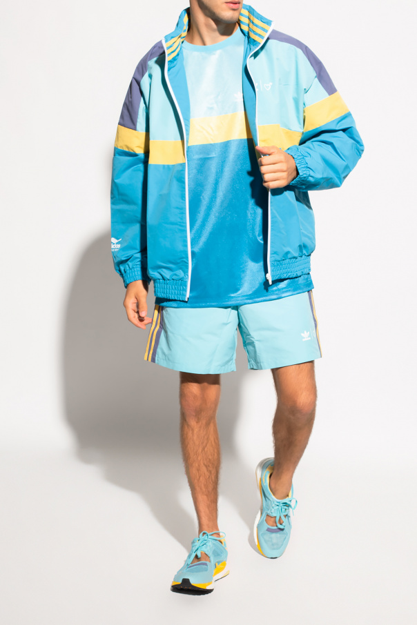 Blue and yellow jacket from ADIDAS Originals x Human Made. Fastened with a zip, this garment features a white logo print, concealed hood, two slip pockets and ribbed trims. Human Made is a streetwear brand by Japanese designer and musician Nigo.