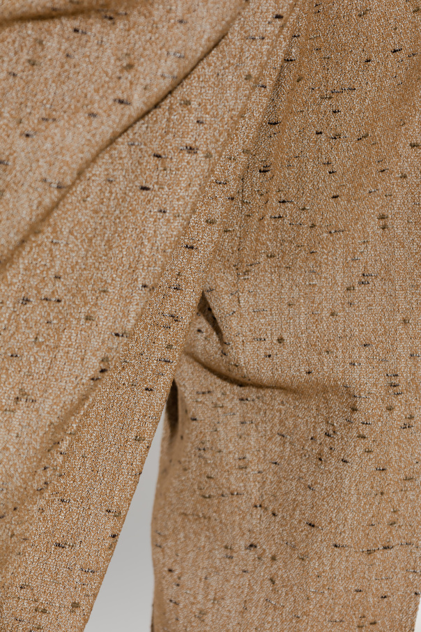 Beige pleat-front trousers from Bottega Veneta. Crafted from a fabric blend, this pair falls with slightly tapered legs and features a zip fly with a button and hook, four slip pockets and black trims.