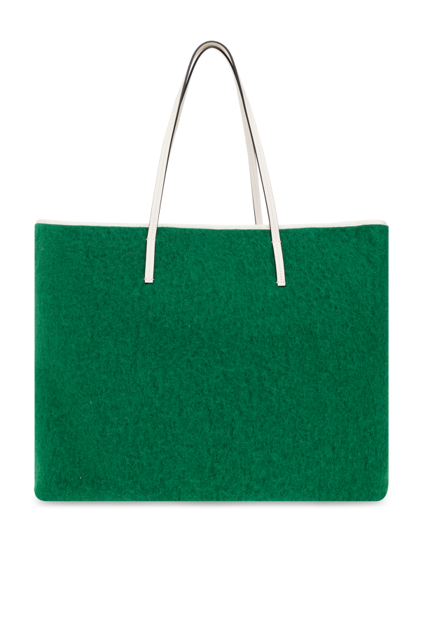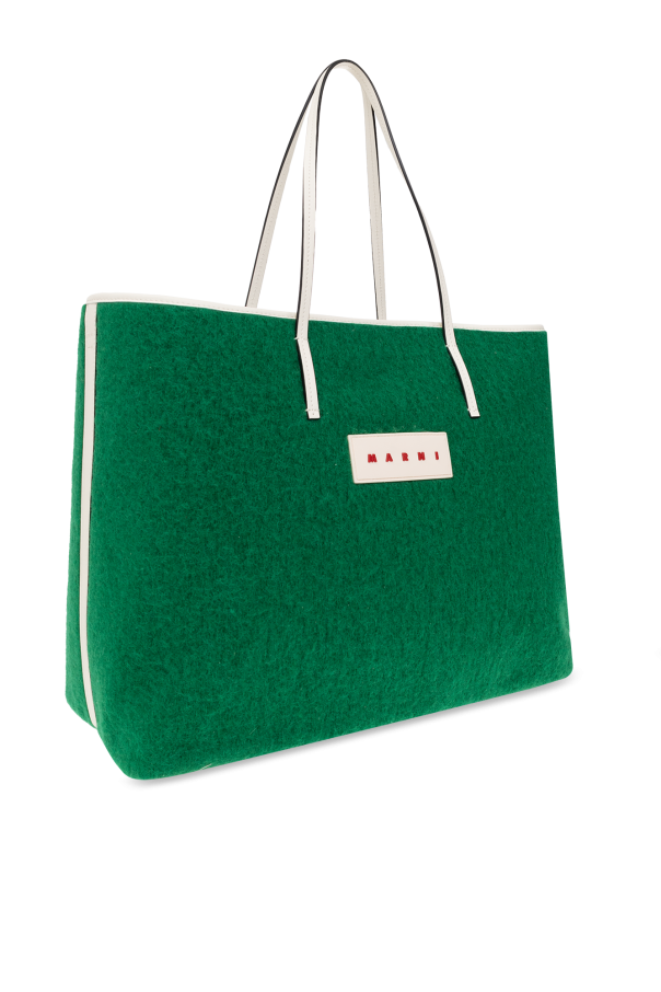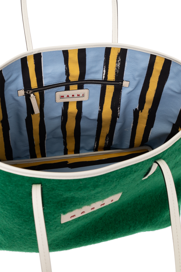 Green and white reversible shopper bag from Marni. Made of wool, this design features a logo patch, two half-round handles, striped lining, zip pocket and silver-tone metal hardware.