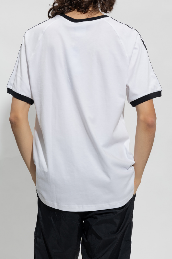 White T-shirt from ADIDAS. Crafted from cotton, this short sleeve design features the brand’s signature three black stripes, yellow, red and black logo embroidery and ribbed edges.