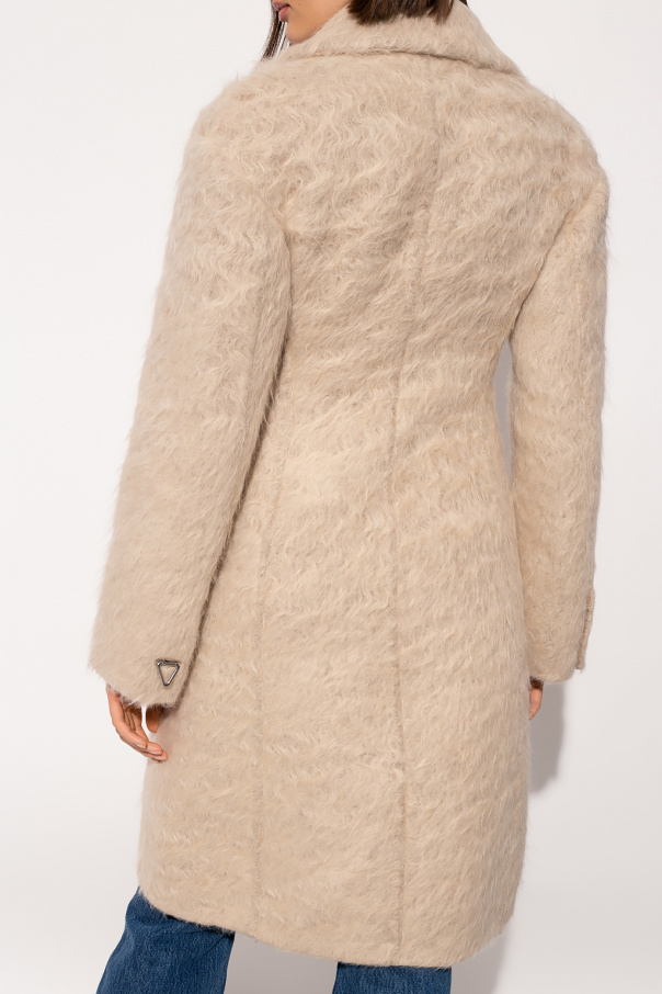 Light beige double-breasted coat with notch lapels from Bottega Veneta. Made of a wool and cotton blend, this long sleeve design features black button fastenings and two flap pockets.