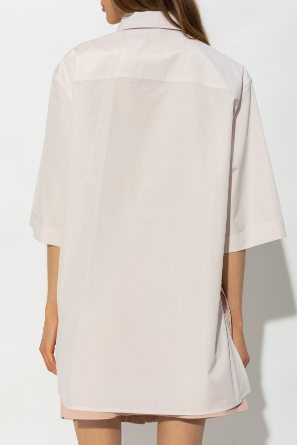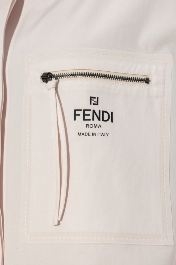 Light pink oversize shirt from Fendi. Fastened with buttons with a concealed placket, this garment features a zipped front pocket with tassels and a black logo print, collar, short sleeves with turn-ups and side vents.