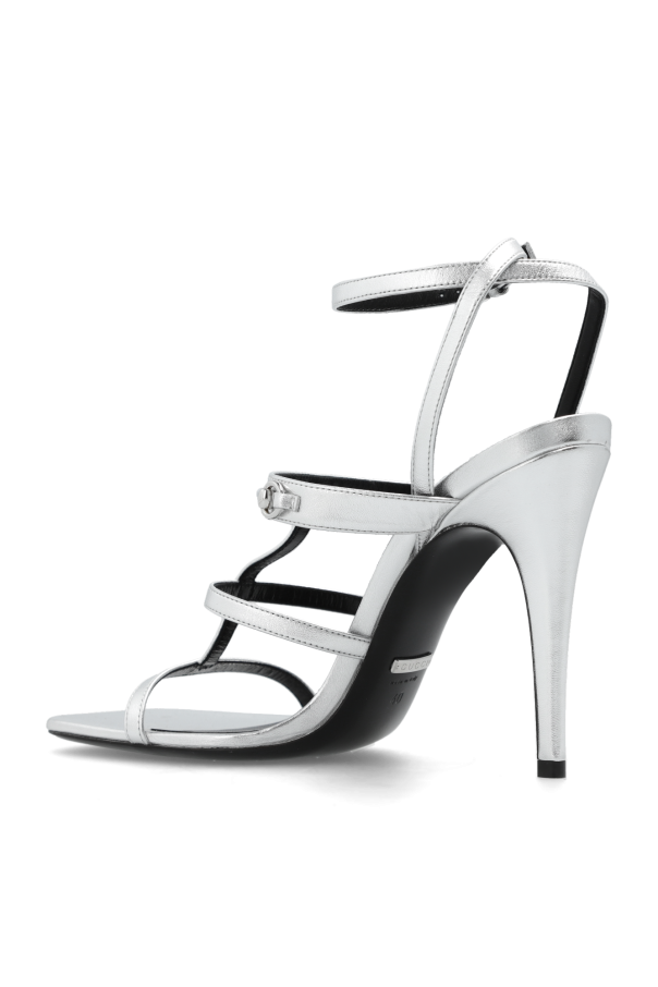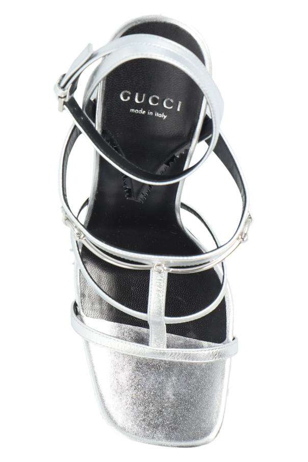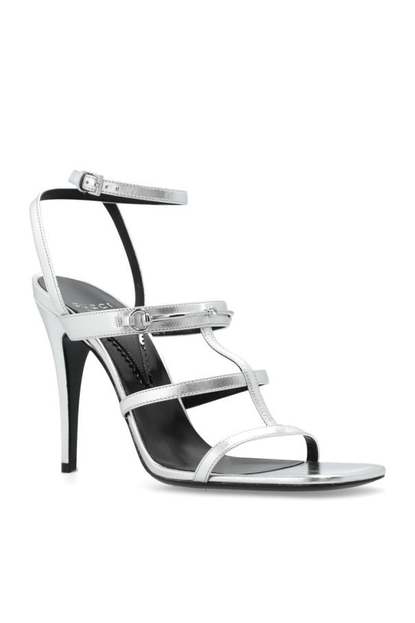 Silver-tone heeled sandals from Gucci. Made from leather, this model sits on a black leather sole and showcases an adjustable ankle strap with a buckle, a square toe and the brand's signature horsebit hardware on the front.