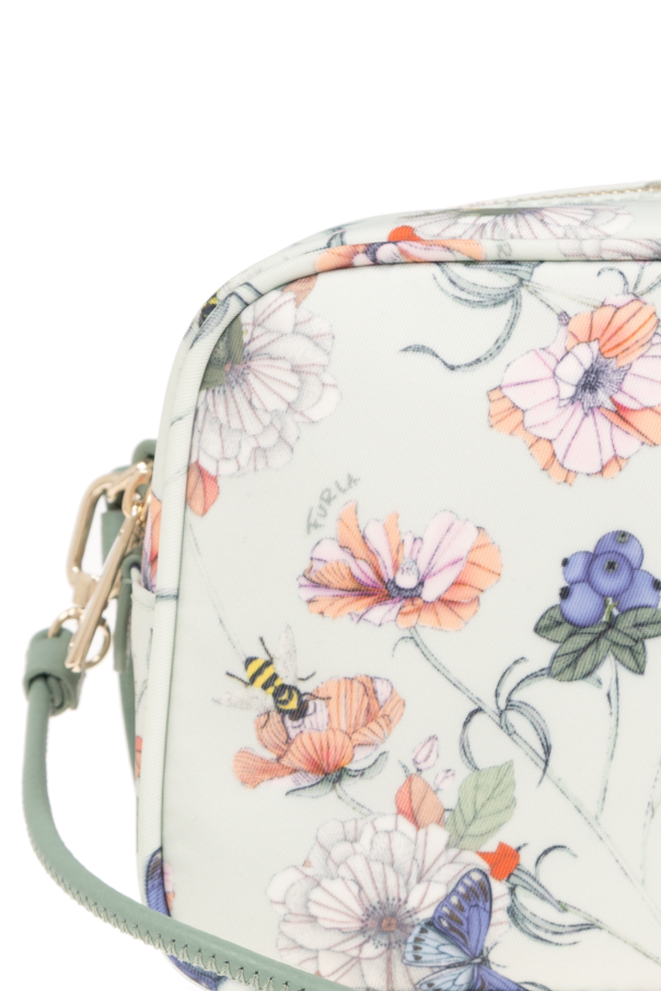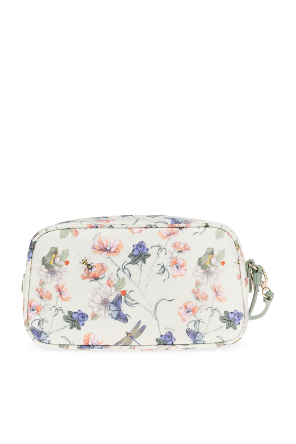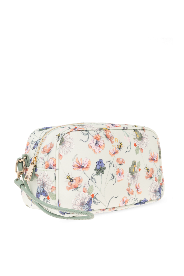 Light green ‘Camelia Large’ wash bag from Furla. Made of fabric with a multicolored floral and animal pattern, this model features a zip fastening, gold-tone logo print, detachable strap at the side, gold-tone metal hardware and one internal compartment with one slip pocket.