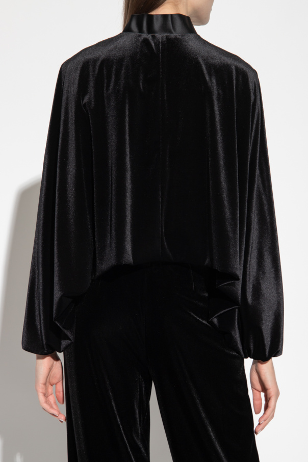 Black sweatshirt from Emporio Armani. Made of velour, this garment features a two-way zip, chest pocket with an embellished pocket square, long puff sleeves with a sewn-in cape and ribbed trims at the hem and cuffs.