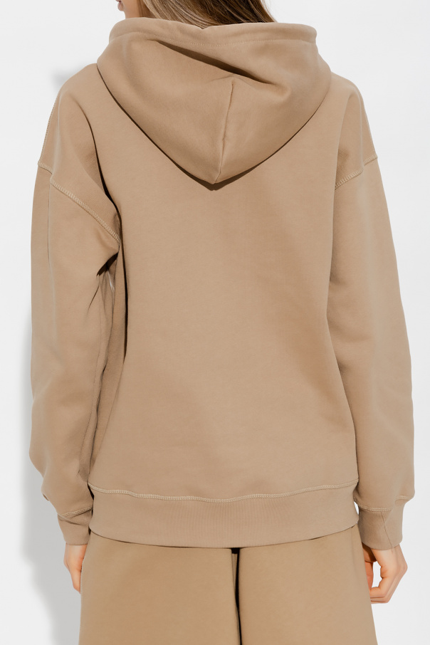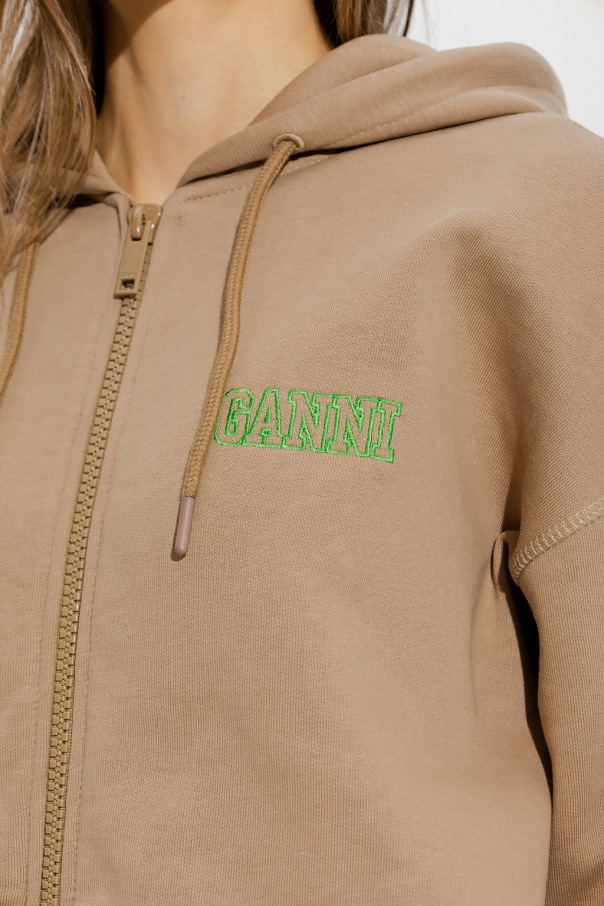 Light brown sweatshirt with a drawstring hood from Ganni. Crafted from organic cotton with a relaxed fit, this style showcases an embroidered green logo on the front, a zip fastening, two slip pockets, long sleeves and a ribbed bottom hem and cuffs.