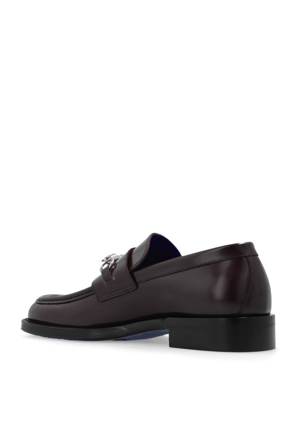 Maroon ‘Barbed’ loafers from Burberry. Made of leather, this pair features a metal barbed wire detail and dark grey leather sole embossed with the Equestrian Knight pattern.