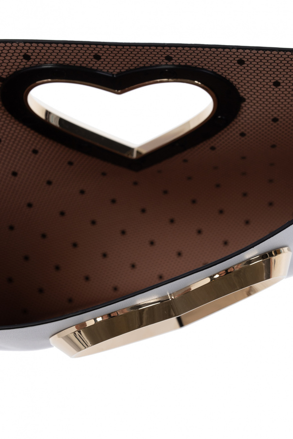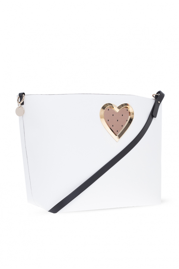 White shopper bag from Red Valentino. Printed at front with the brand's logo, this design features two decorative gold-tone metal heart handles, a detachable and adjustable shoulder strap and one internal compartment with a slip pocket and lining printed with the brand's signature ‘Point d’Esprit’ theme.