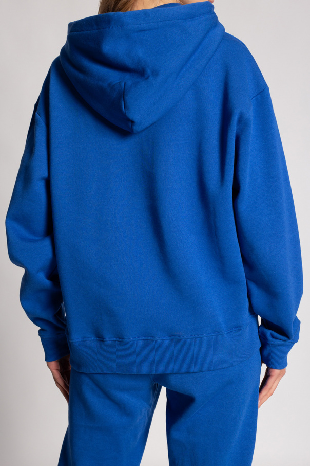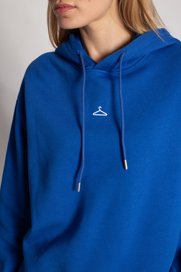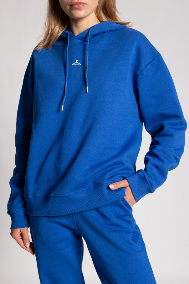 Navy hoodie from Holzweiler. Made of organic cotton, this garment features long sleeves, a printed logo pattern in white, a drawstring hood and ribbed trims at the hem and cuffs.