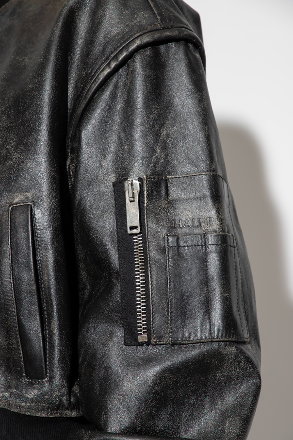 Black bomber jacket from HALFBOY. Crafted from bovine leather with a vintage effect, this design features a zip and snaps, three slip pockets, one zip pocket, embossed logo, two front pockets and ribbed trims at the collar, hem and cuffs.