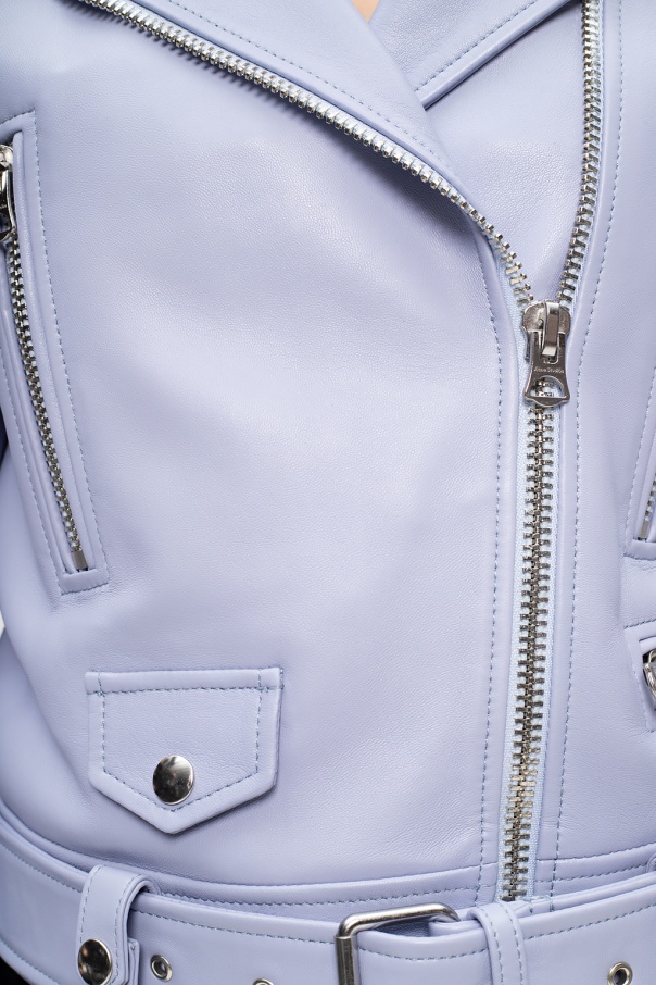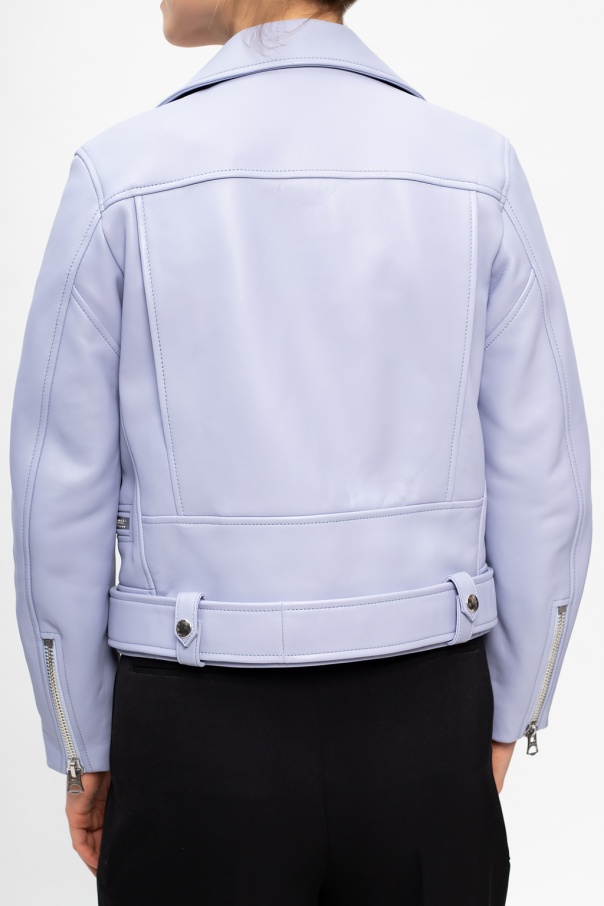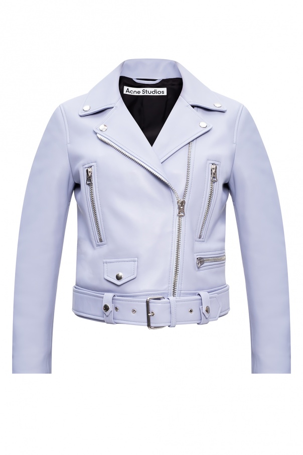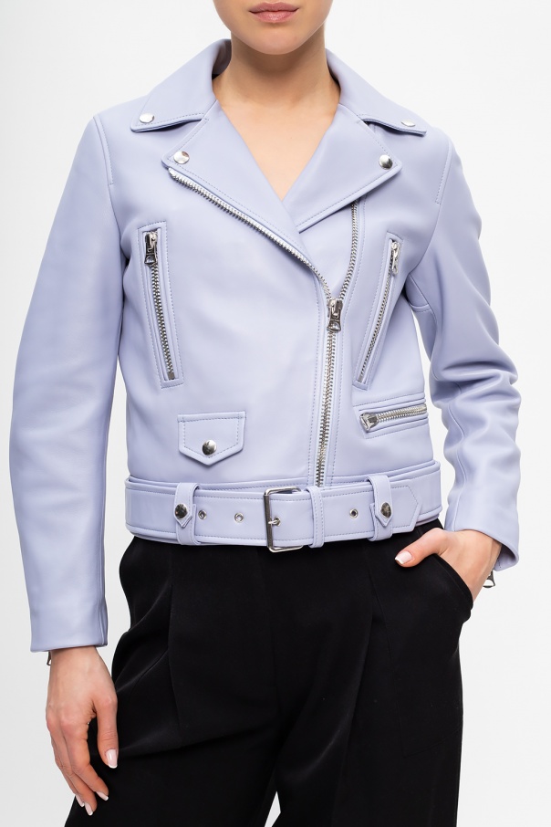 Purple jacket with notch lapels from Acne Studios. Made of lamb leather, this garment features a zip fastening, three zip pockets, one snap-fastened flap pocket and a buckle belt at the hem.