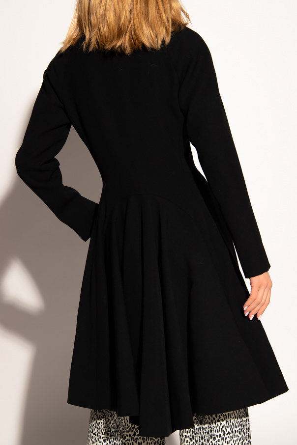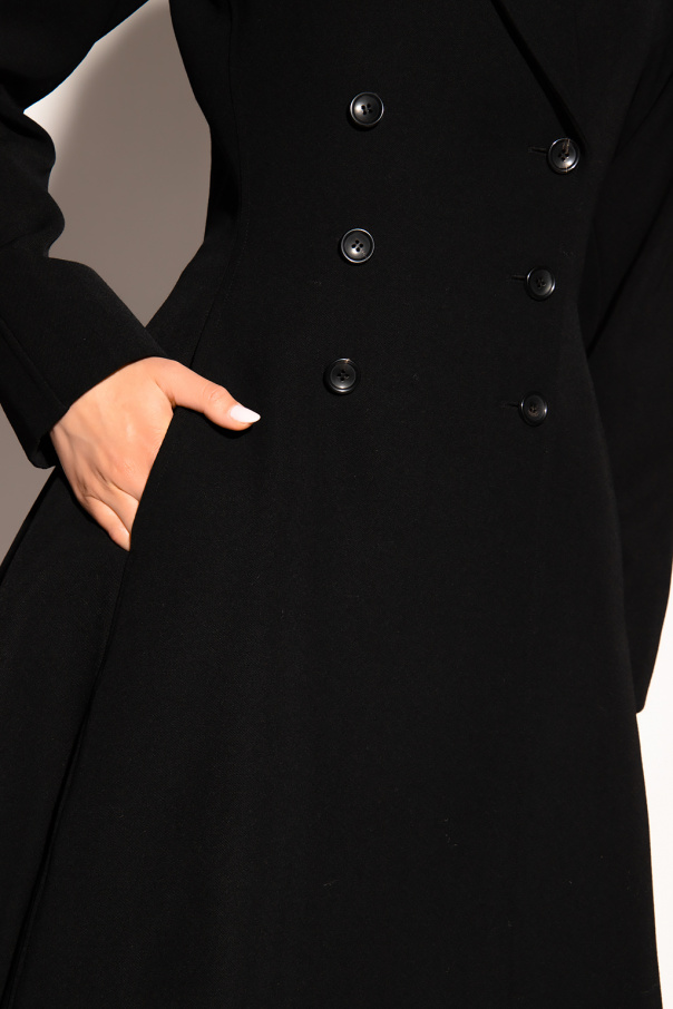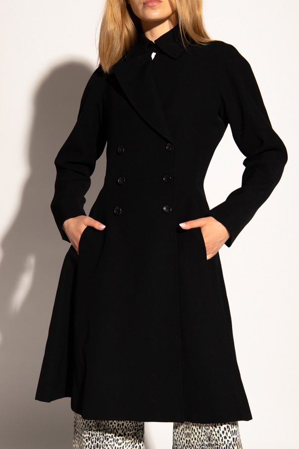 Black double-breasted coat from Alaia. Made of wool with a flared silhouette, this style features button fastenings, long sleeves and two slip pockets on the front.