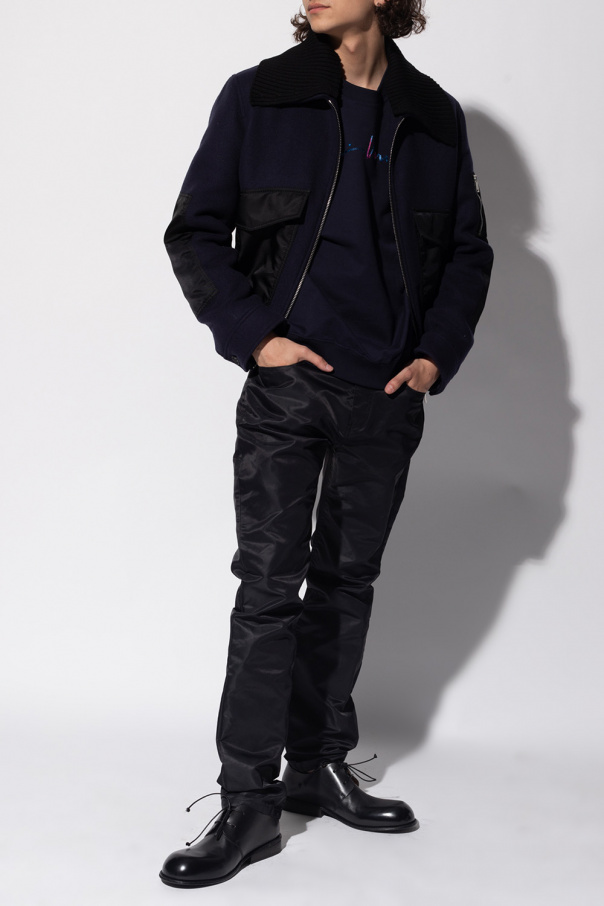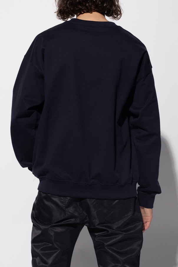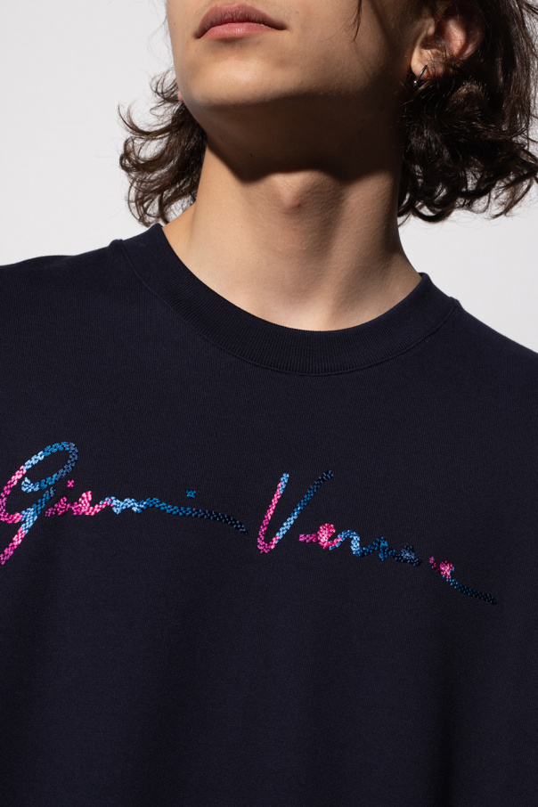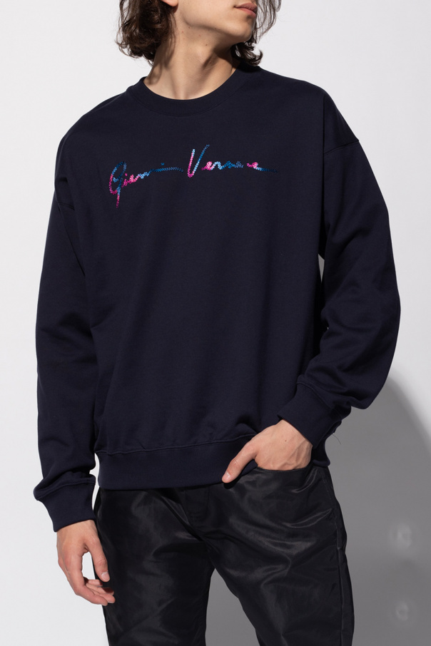 Navy crewneck sweatshirt from Versace. Made of cotton, this design features an embroidered logo pattern in blue and pink as well as ribbed trims at the neck, hem and cuffs.