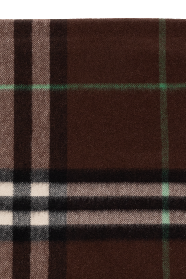 Dark brown scarf from Burberry. Made of cashmere, this design features the brand’s signature multicolored check and fringe edges.