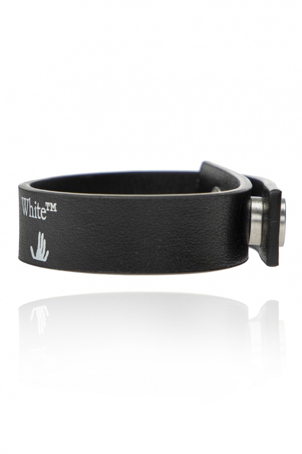 Black bracelet from Off-White. Made of leather. Snap fastening. Decorated with a white logo print.