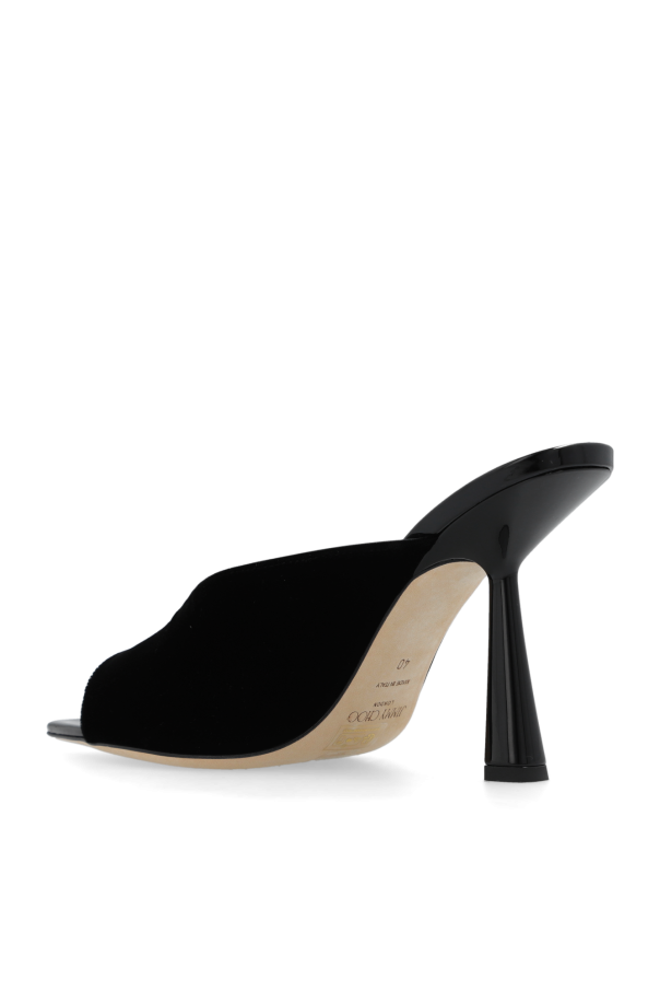 Black ‘Maryanne’ heeled mules with a velour finish from Jimmy Choo. Trimmed with leather, this pointed toe pair rests on a glossy heel and a light beige leather sole.