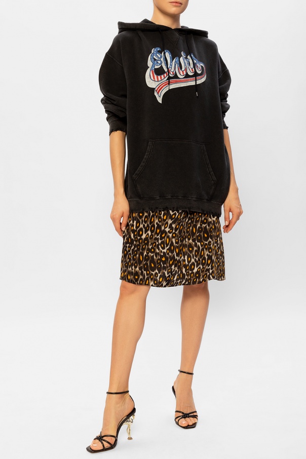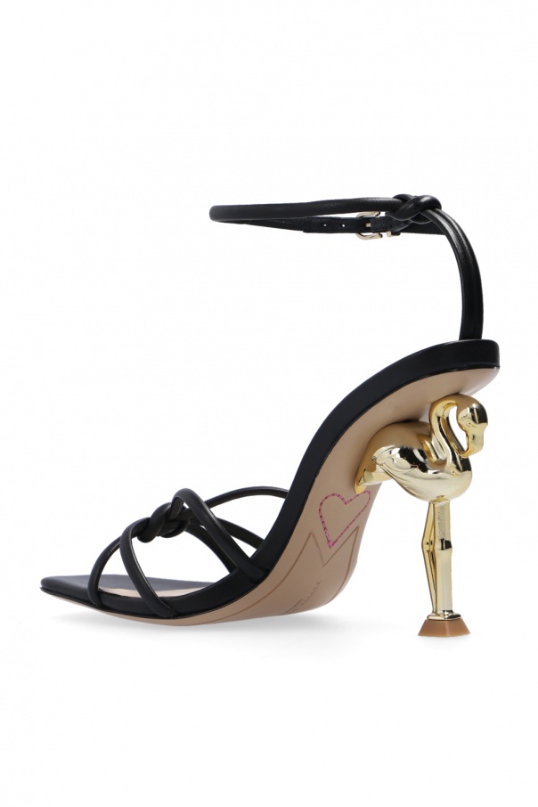 Black ‘Flo Flaming’ heeled sandals from Sophia Webster. Crafted from leather, these shoes feature a buckled ankle strap, woven element, holographic effect, decorative heel with a flamingo motif in gold-tone and a beige leather sole.