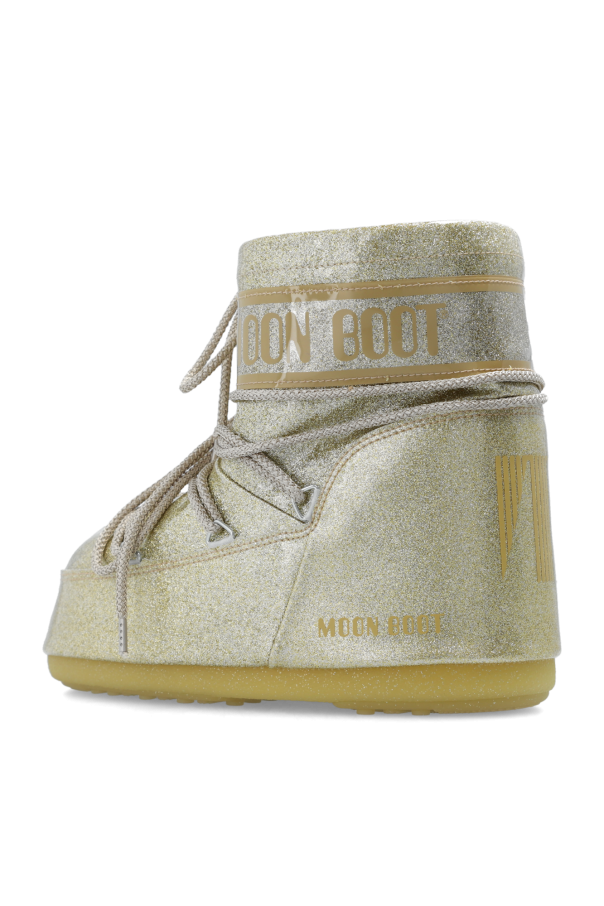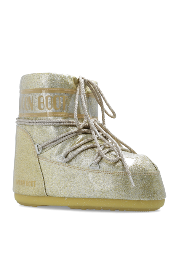 Gold-tone ‘Icon Glitter’ snow boots from Moon Boot. Spruced up with glitter, this waterproof model sits on a beige tread rubber sole with suction cups to ensure superb grip on any surface and showcases the brand's logo, silver-tone metal hardware, elastic crisscross tube laces (do not use them to pull off shoes) and an elasticized hem. Inspired by the peculiar shape and technology of the astronauts’ boots, the iconic style was designed in 1969 after the first Moon landing.