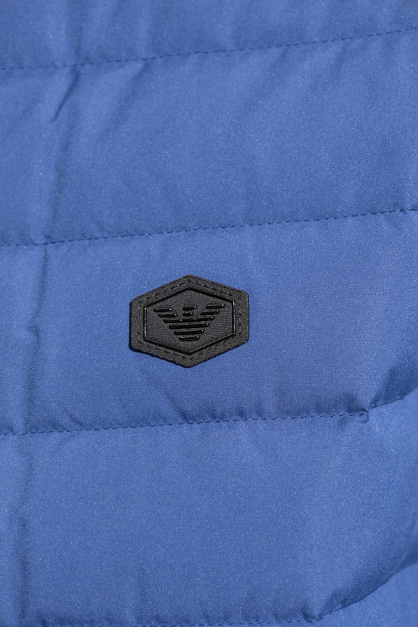 Dark blue down jacket with a stand collar from Emporio Armani. Fastened with a two-way zip, this garment features a black logo patch, two snap-fastened pockets and long sleeves with ribbed cuffs.