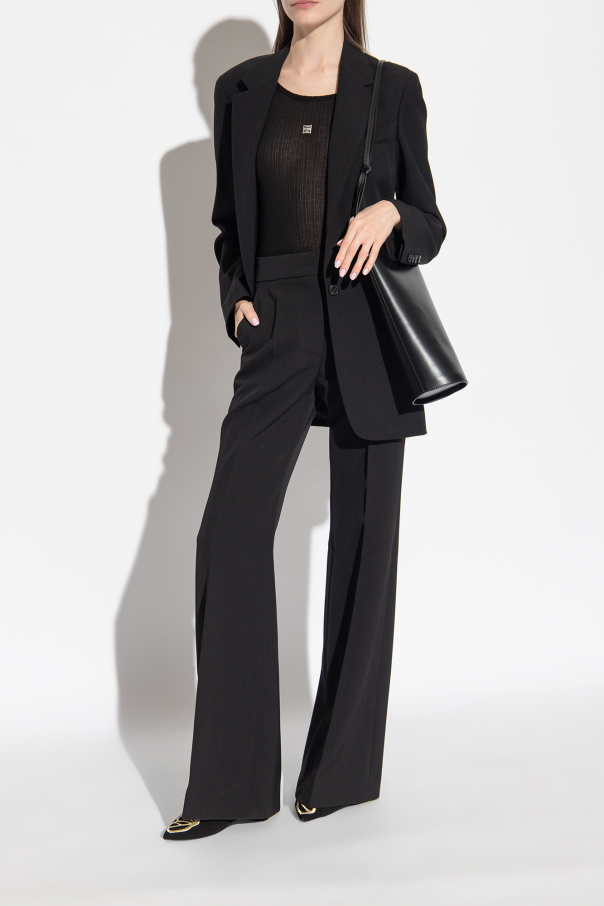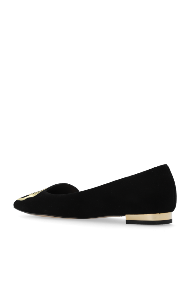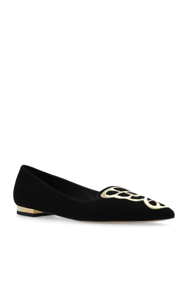 Black ‘Butterfly’ ballet flats from Sophia Webster. Made from suede with a pointed toe, this model sits on a beige leather sole and showcases the brand's signature gold-tone butterfly wings embroidered on the front.