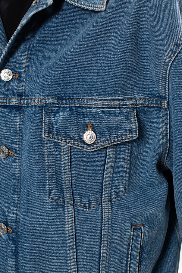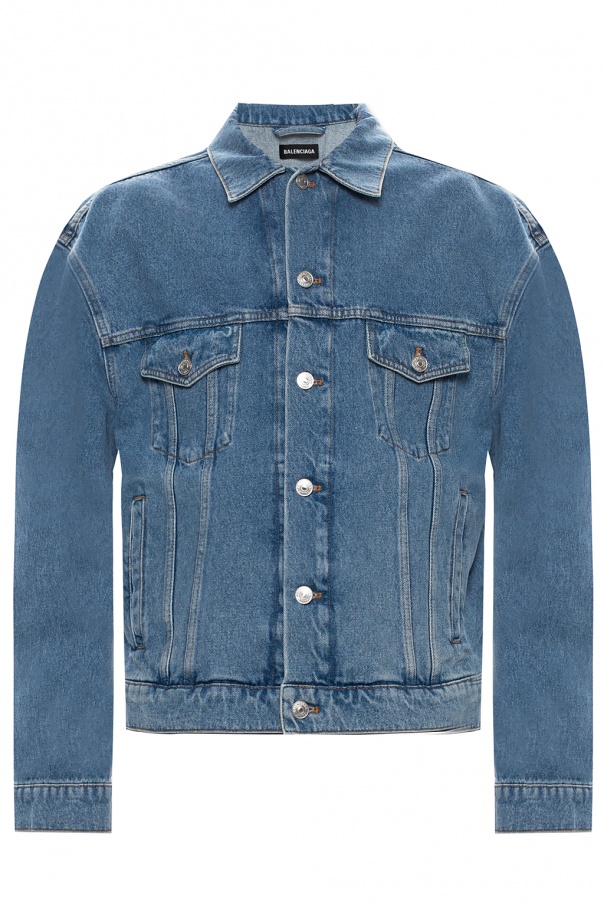 Blue denim jacket from Balenciaga. Crafted from washed-out cotton, this style fastens via buttons and showcases a black graphic print with the brand's logo and exposed orange topstitching details. Two side welt pockets and two flapped chest pockets with button closures complete the look.