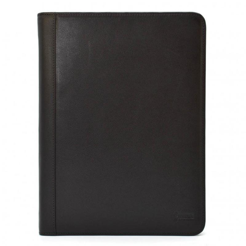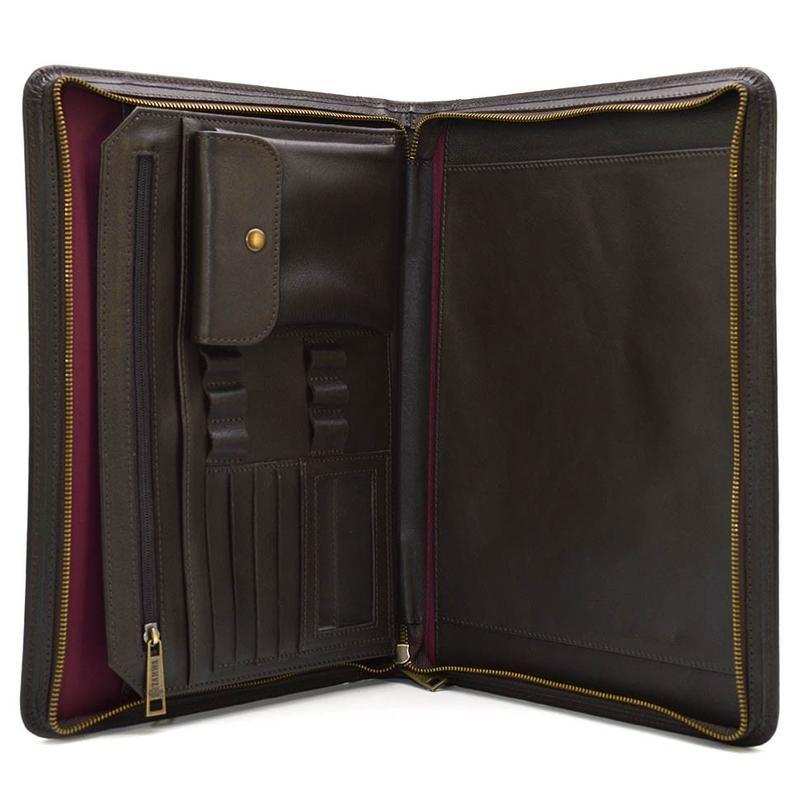 Внутри: три больших отделения-кармана для бумаг формата А4, один врезной карман с молнией вмещает А5+, пять слотов-карманов под пластиковые карты или визитки, один кожаный, закрывающийся клапаном на кнопке карман для мелких предметов, а также три держатели для ручек. Благодаря тому, что папка закрывается на молнию, можно хранить документы внутри папки, а не только в карманах. Папка внутри в основном обшита кожей и немного тканевым подкладом. На лицевой стороне, в правом нижнем углу аксессуара размещается тиснение с логотипом производителя.