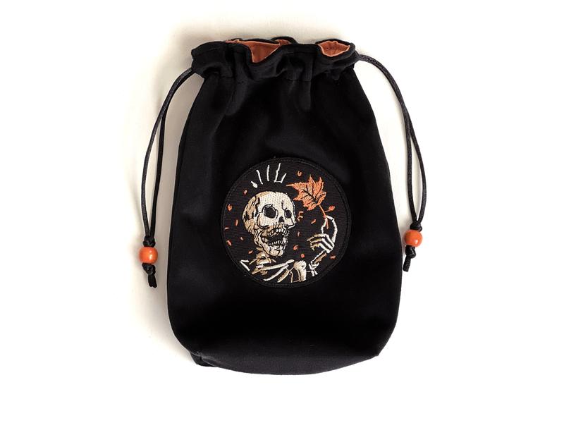 Оксамитовий мішечок з аплікацією-вишивкою скелета з осіннім листочком.