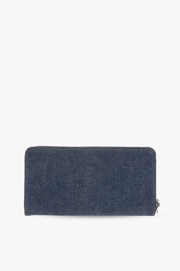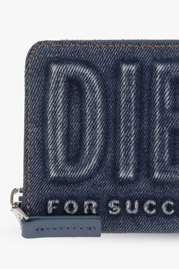 Navy denim wallet from Diesel. Fastened with a zip, this item features a raised logo and metal hardware in silver-tone. It has two bill compartments, zipped coin pocket, two slip pockets and twelve card slots.