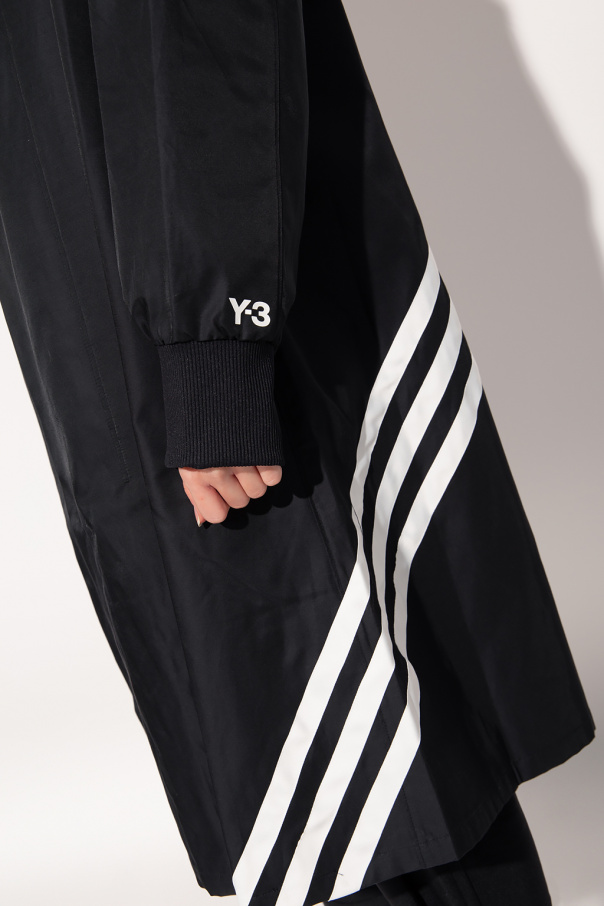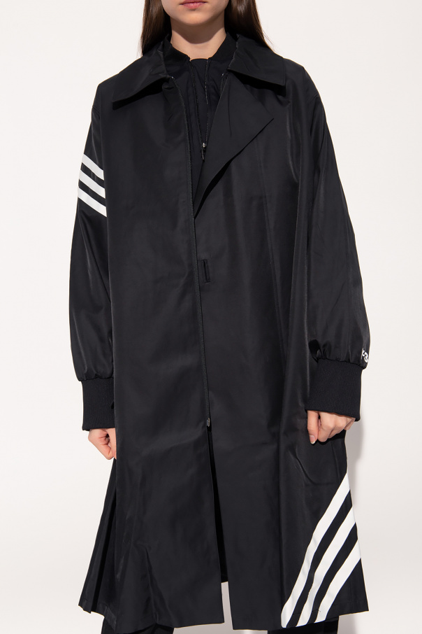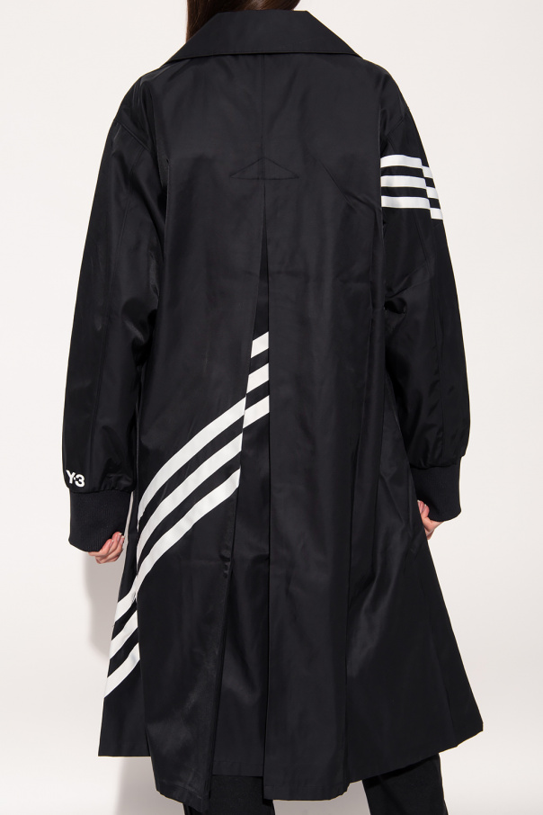 Black coat from Y-3 Yohji Yamamoto. Fastened with a two-way zip and buttoned belt, this garment features the label’s signature side stripes with a logo at the sleeves and back, two slip pockets and long sleeves with ribbed cuffs.