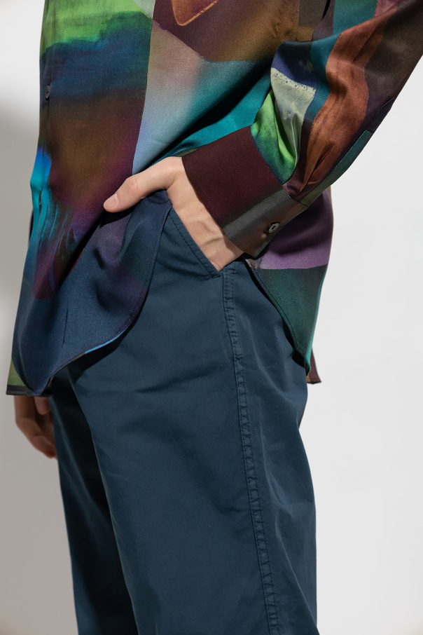 Navy trousers from Paul Smith. Made of organic cotton, this tapered leg pair features a zip and button closure, two front pockets and two back pockets