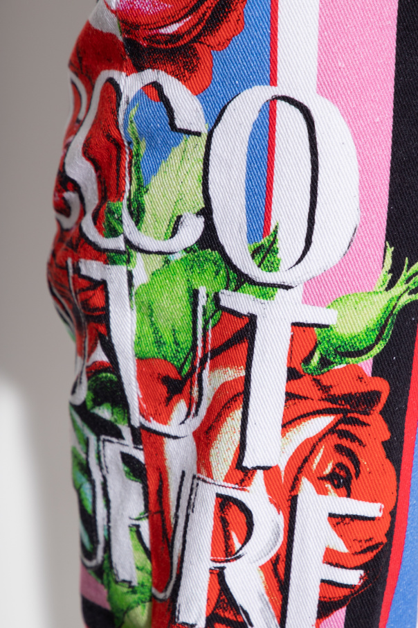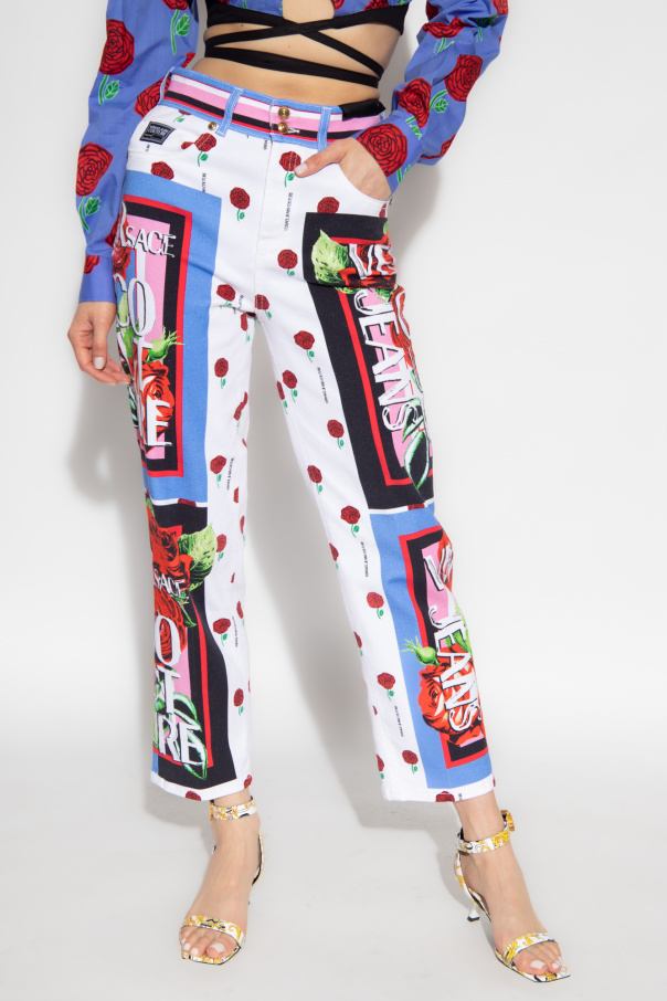 Multicoloured jeans from Versace Jeans Couture. Embellished with a pattern including roses, stripes and logo, this pair falls with straight legs and features a zip fly with a button, classic five pockets and patches on the front and back.