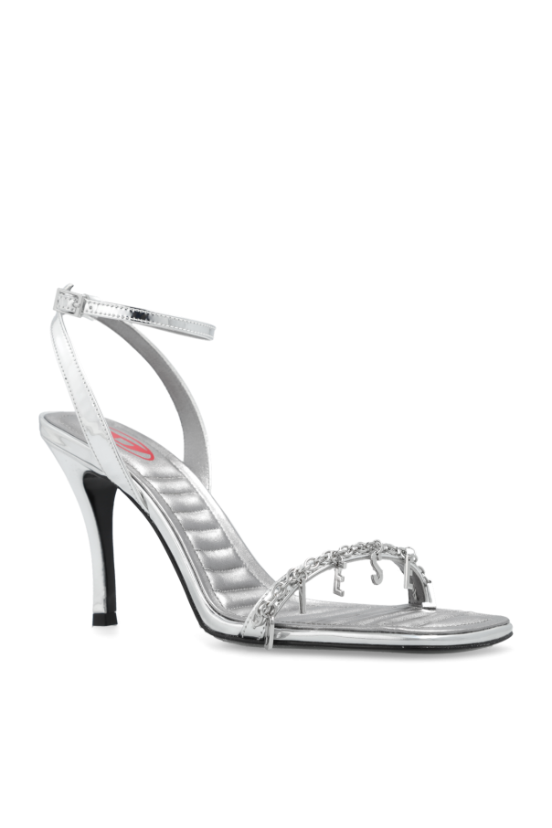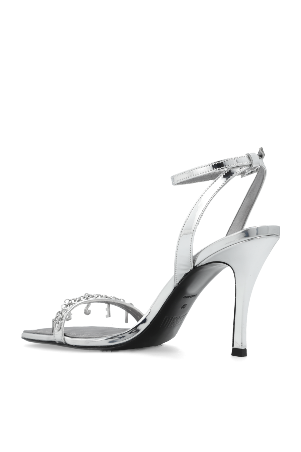 Silver-tone ‘D-VINA SDL’ heeled sandals from Diesel. Made of leather, this pair features sits on a black leather sole and features an adjustable buckled ankle strap, chain with logo charms and a square toe.