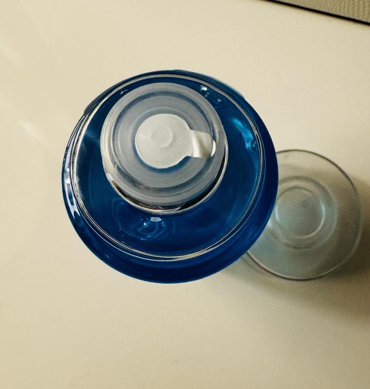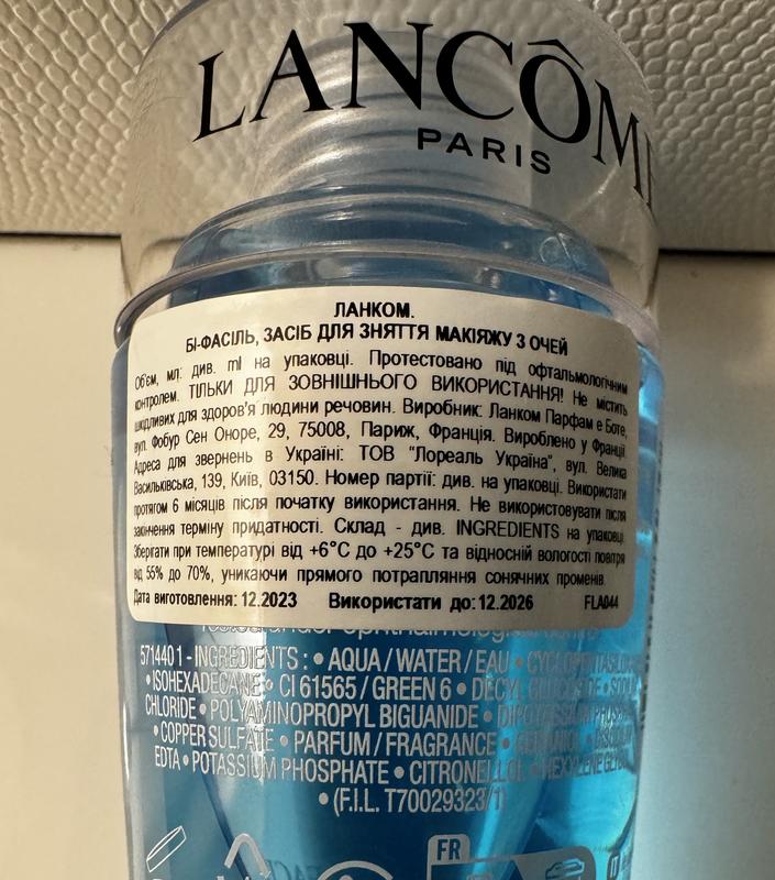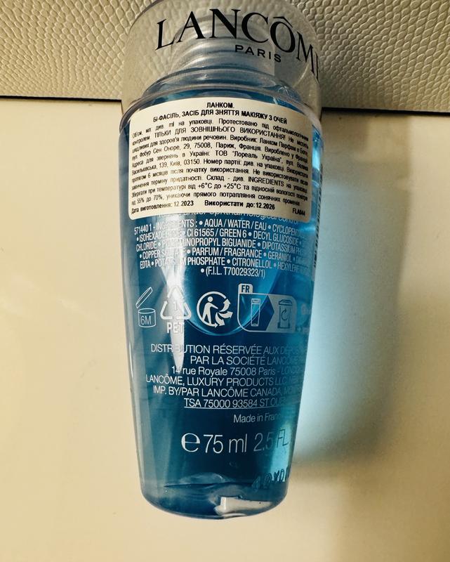 Двухфазное средство состоит из светло-синей масляной и светло-голубой водной фаз. Имеет легкий цветочный запах. В состав лосьона входят: глицерин, витаминный комплекс, молочные протеины, экстракты миндаля и смягчающие меда и увлажняющие компоненты. Продукт позволяет быстро очищать кожу вокруг глаз, удаляя макияж любого типа, при этом действует очень нежно, придавая коже эластичность и мягкость.