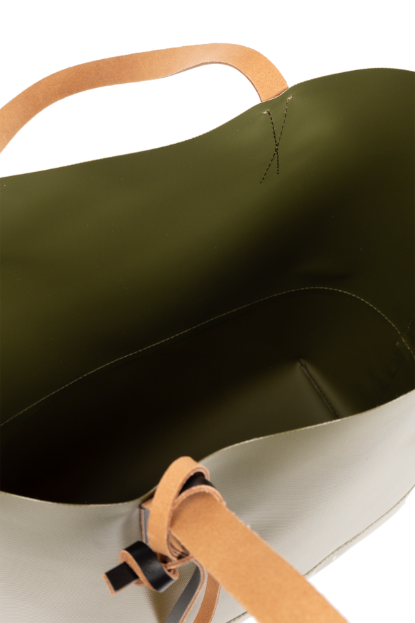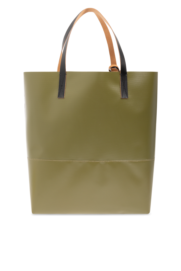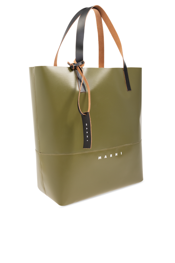 Dark green ‘Tribeca’ shopper bag from Marni. Made of plastic and trimmed with leather, this design showcases a printed white logo on the front, two half-round handles accentuated with a logo-embossed pendant, and one internal compartment.