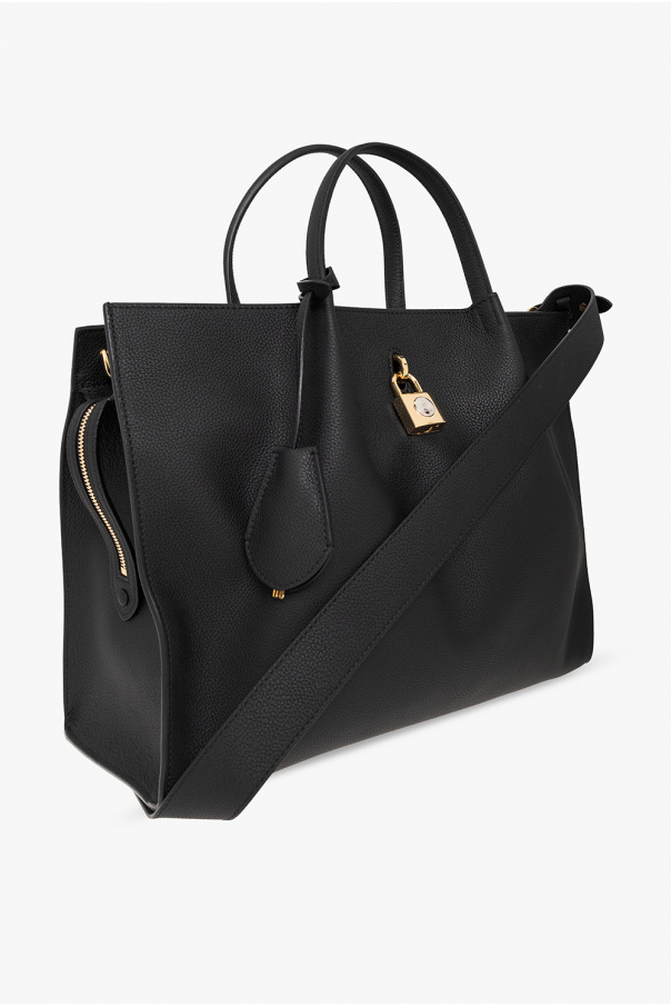 Black ‘Daybag’ shopper bag from Lanvin. Crafted from leather, this design secures with a zipper and features two half-round handles, a zip pocket accompanied by a padlock application on the front, a detachable shoulder strap, gold-tone metal hardware and one internal compartment with a zip pocket.