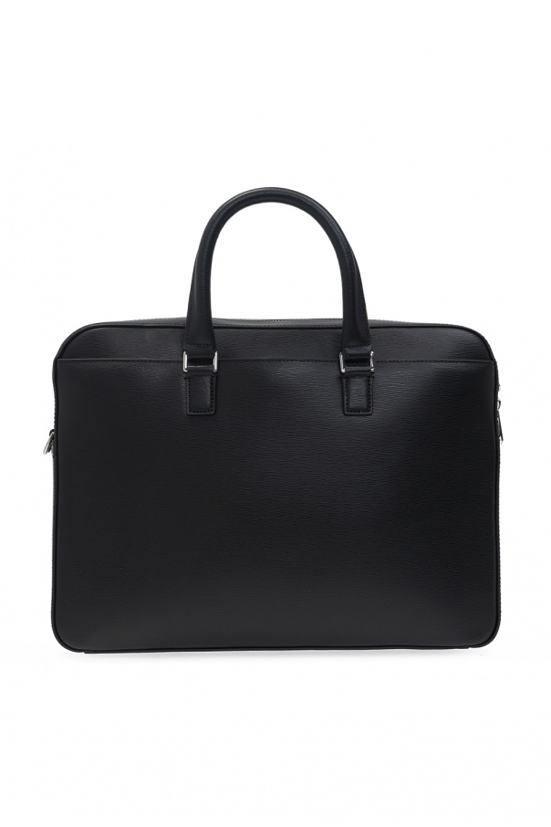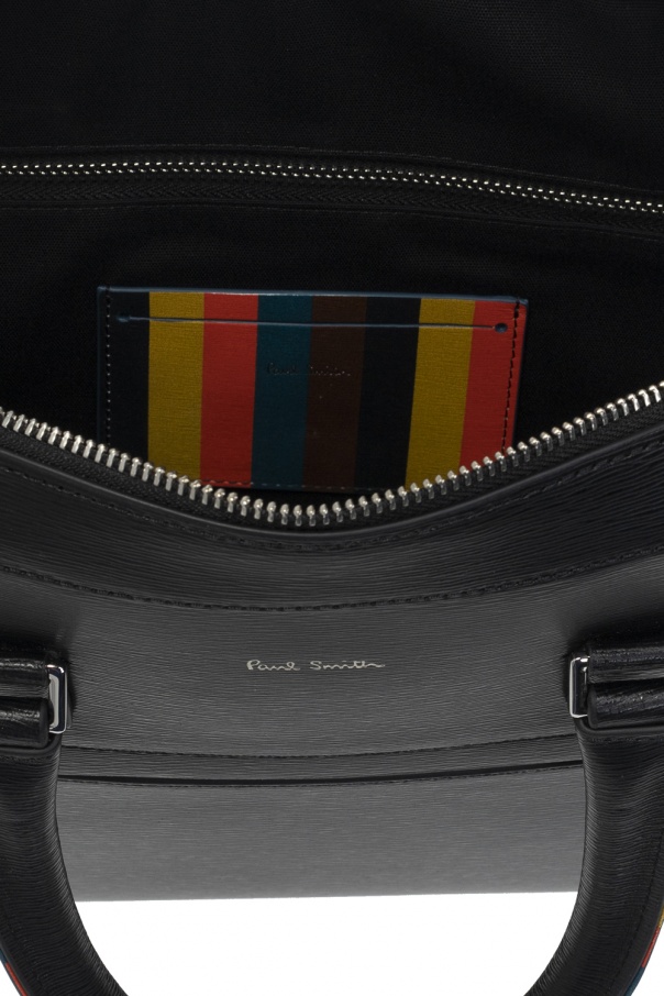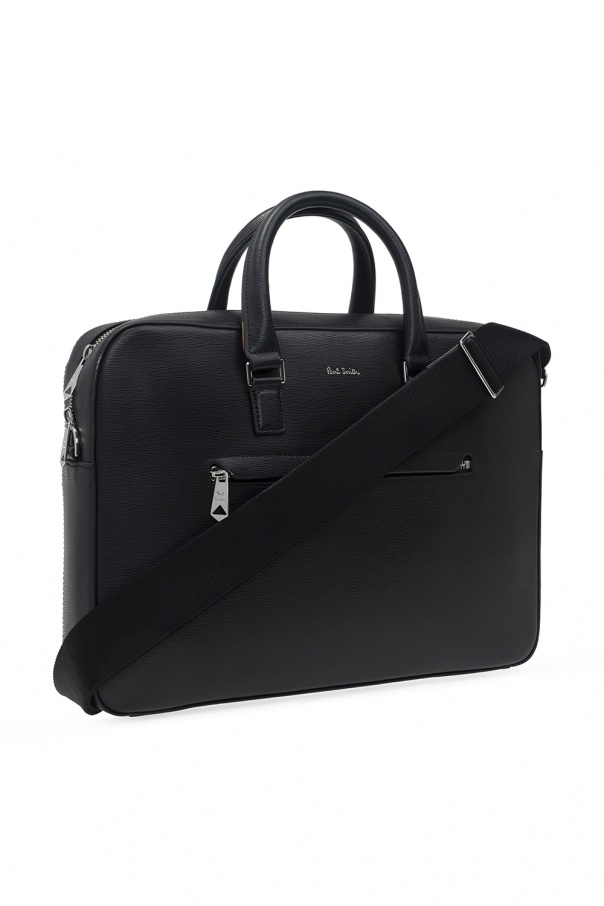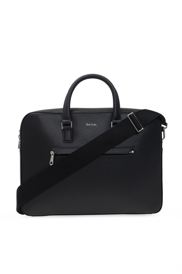 Black briefcase from Paul Smith. Printed with the designer's logo in a silver-tone hue, this textured leather-crafted item fastens via a two-way zip and employs an external zipped pocket on the front, a pocket with a magnetic closure on the back, two half-round handles, a detachable and adjustable shoulder strap and interior with one compartment and one zipped pocket.