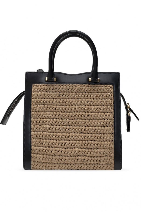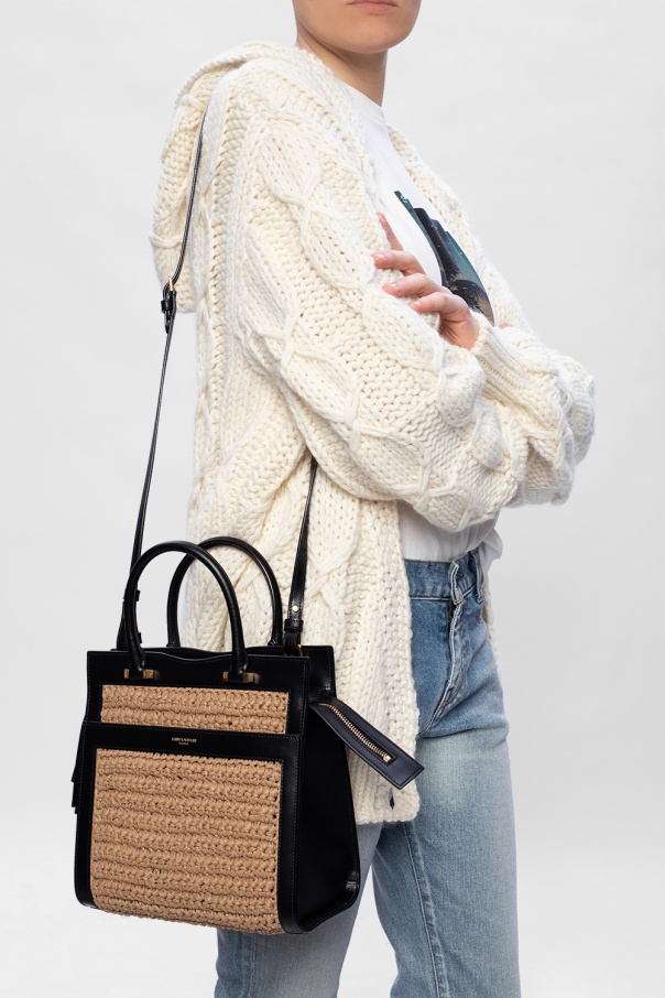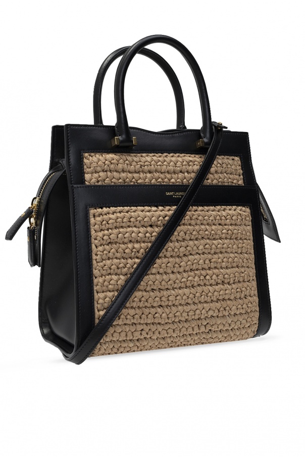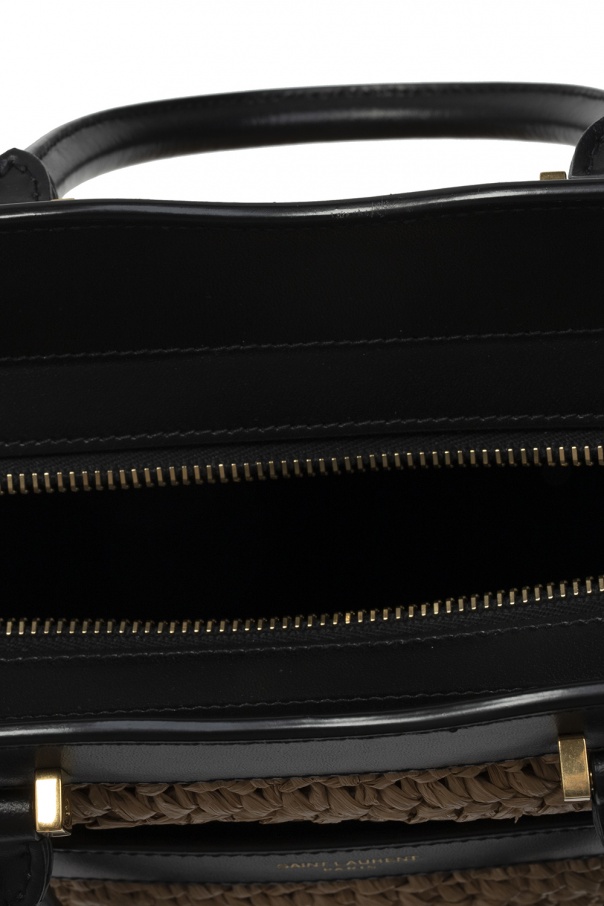 Brown and black ‘Uptown’ woven shoulder bag from Saint Laurent. Size small. Trimmed with bovine leather, this design fastens with a zip and is decorated with a gold-tone logo print. It is complete with a back slip pocket, two half-round handles, adjustable shoulder strap, gold-tone metal hardware and one internal compartment with one slip pocket. Comes with a pouch with a logo and magnetic snap fastening.