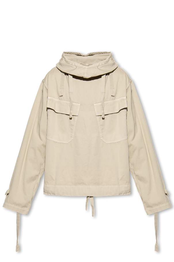 Greyish beige insulated quilted jacket from Dries Van Noten. Made of cotton, this light garment features a drawstring hood, stand collar and hem as well as two flap pockets and long sleeves with ties at the cuffs.