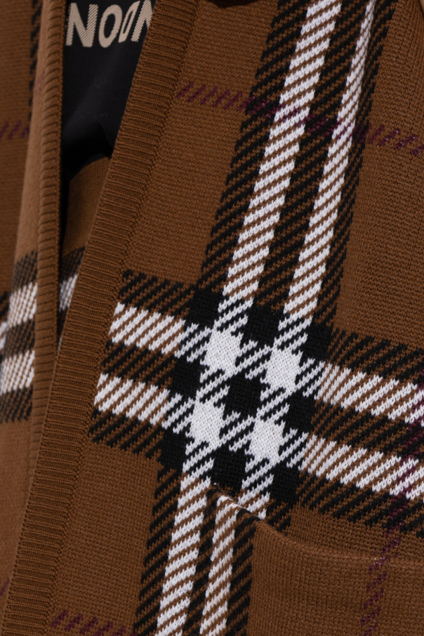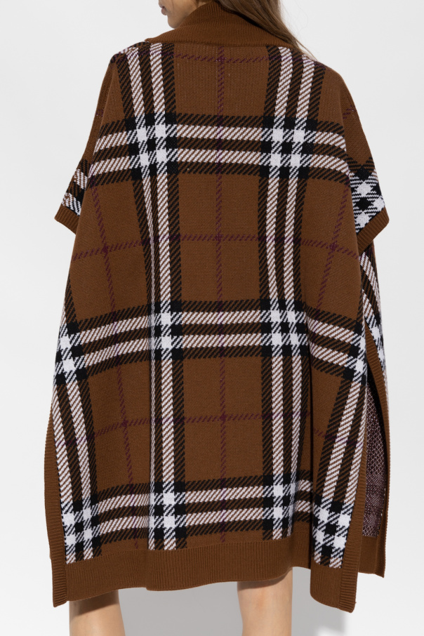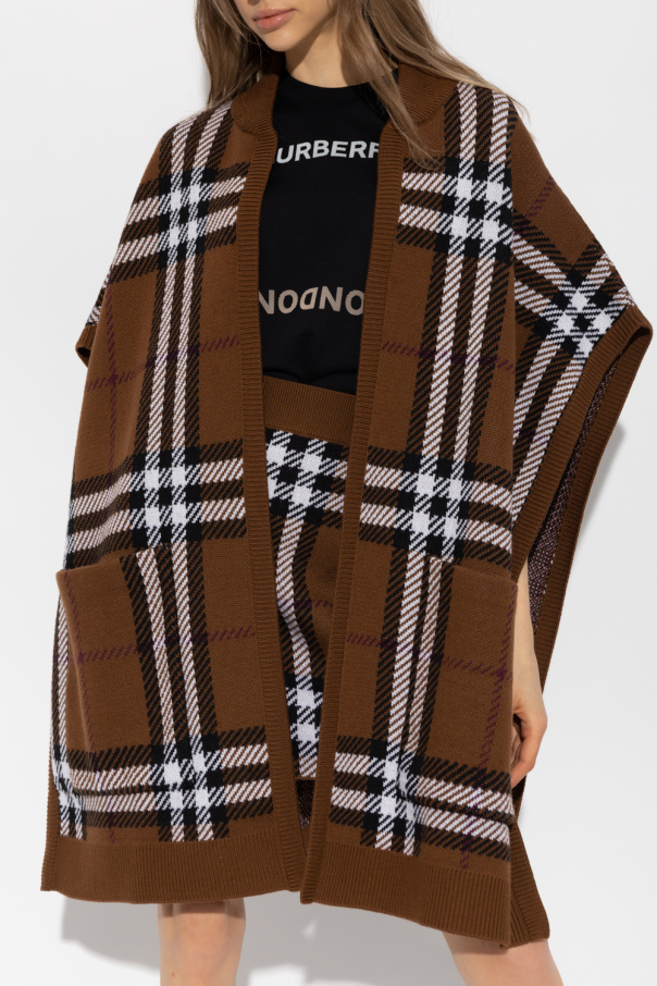 Brown poncho from Burberry. Crafted from wool, this design features the brand’s signature check pattern in black, white and maroon, two slip pockets and ribbed cuffs.