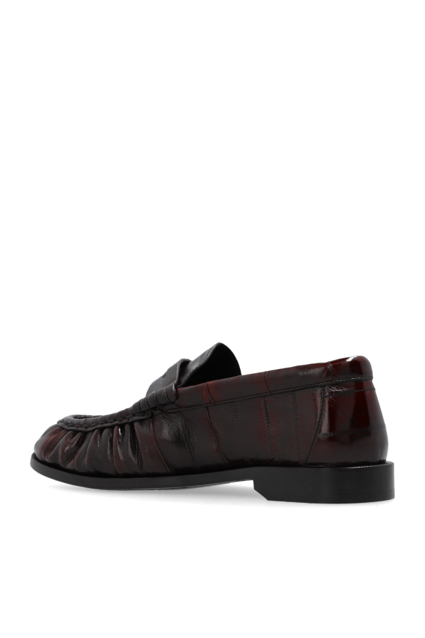 Introducing Le Loafer by Saint Laurent – a testament to timeless elegance and unparalleled craftsmanship. These loafers, a quintessential piece in men's footwear, are rendered in a striking burgundy hue that commands attention while maintaining an air of sophisticated understatement. The exterior of Le Loafer showcases a high-quality leather with a glossy, crocodile-pattern finish, bringing an exotic touch to its classic silhouette. The broad leather strap across the vamp, adorned with a golden designer logo, adds a distinctive character and luxury appeal. This detail not only accentuates its refined aesthetics but also serves as a hallmark of Saint Laurent's attention to detail and commitment to luxury. The interior, lined in dark-toned leather, ensures comfort and durability, while the flat sole, crafted from leather, underscores the loafer's sleek design and functionality. The inclusion of the designer's logo inside the shoe further affirms its exclusive status, making Le Loafer an emblem of style and quality. Why Purchase This Product? Exquisite burgundy color, adding a touch of elegance to any outfit. Luxurious crocodile-pattern leather, offering a unique and sophisticated look. Flat, leather sole for enduring comfort and style. Signature Saint Laurent detailing, including a golden logo on the vamp, signifying exclusivity. Versatile design, perfect for both formal and casual ensembles.