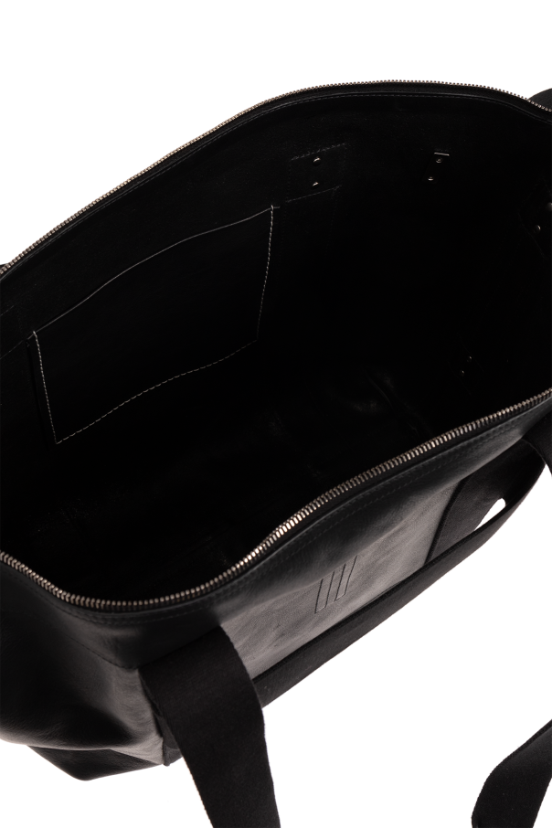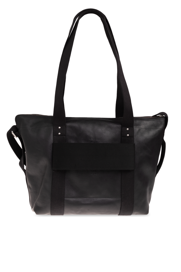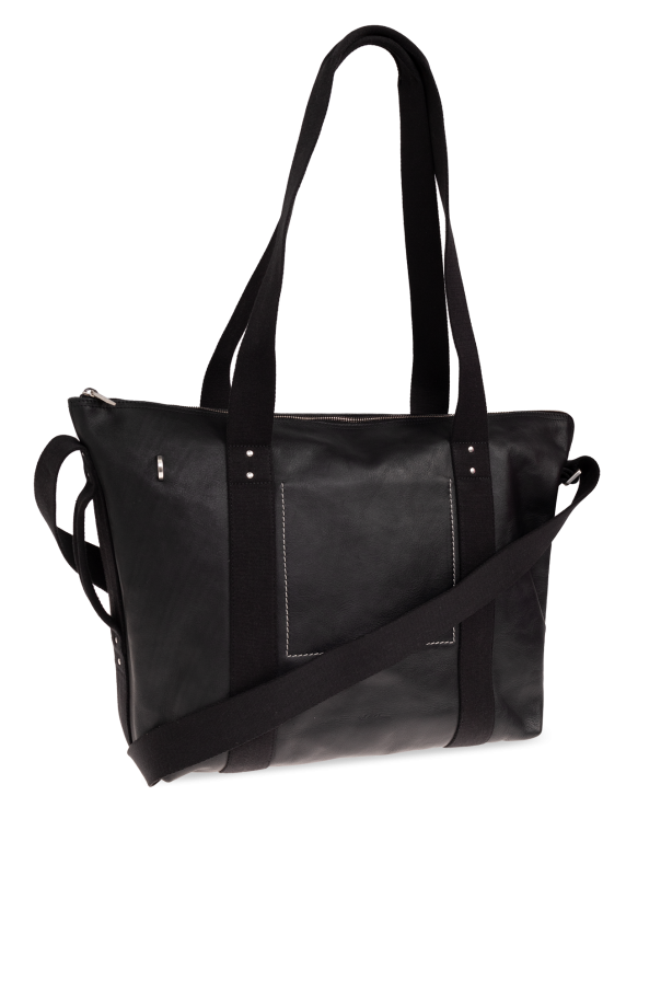 Black ‘Trolley’ shopper bag from Rick Owens. Made of calf leather, this model features a zip fastening, two half-round handles, adjustable shoulder strap, the brand’s signature stitches, silver-tone metal hardware and one internal compartment with two slip pockets and one zip pocket.