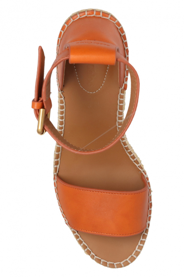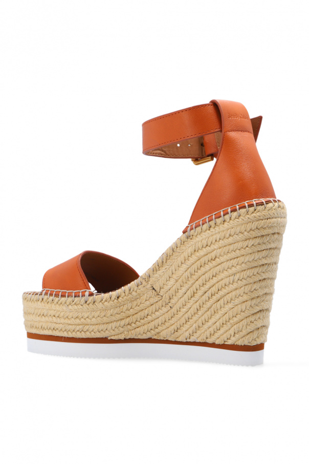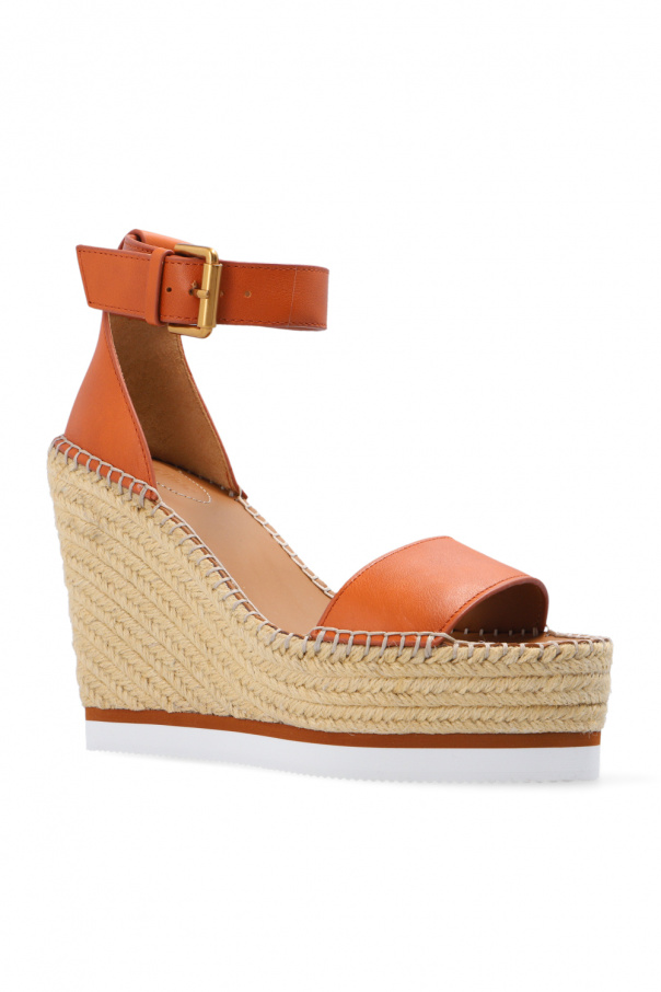 Light brown and beige 'Glyn' platform sandals from See By Chloé. Crafted from calf leather, this model features a leather ankle strap with a buckle, gold-tone metal hardware and a white rubber sole.