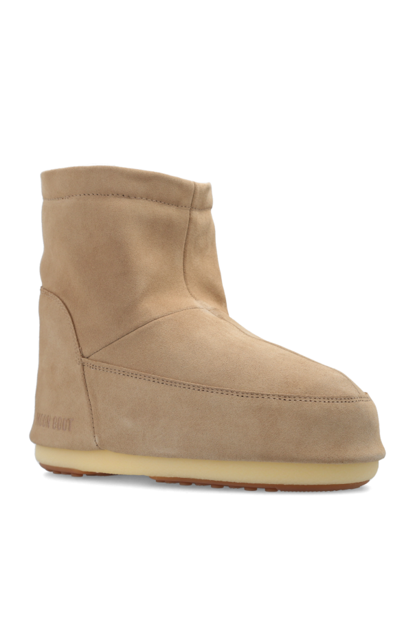 Beige ‘Icon Low Suede’ insulated snow boots from Moon Boot. Made of suede, this model showcases an embossed logo and a light midsole with suction cups on a brown and cream tread rubber sole to ensure good surface control. Inspired by the footwear worn by astronauts during the 1969 lunar landing, this project combines technical features with a contemporary look.