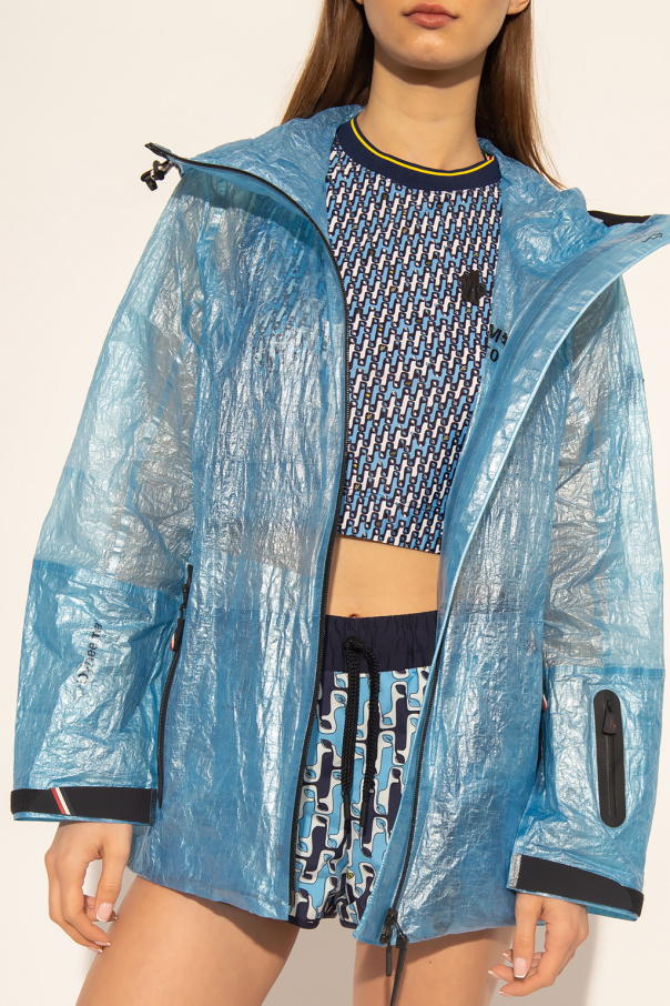 Blue 'Landry' jacket from Moncler Grenoble, the design is part of the ‘Moncler Grenoble Day-Namic’ collection. Crafted from semi-sheer Dyneema®, this style fastens via a two-way zipper and showcases printed lettering on the front, a sleeve logo patch, slide vents on the sides, three zipped pockets, a drawcord-adjustable hood and hem and long sleeves with velcro-fastened cuffs. It can be easily stowed away into a drawstring pouch.