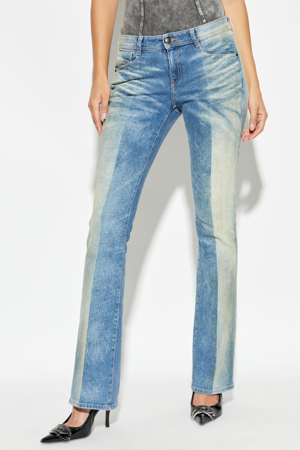 Introducing the 1969 D-EBBEY-FSF Flared Jeans, a masterful creation from the illustrious house of Diesel. This exclusive piece from our premium collection epitomizes refined elegance and modern sophistication, designed for the discerning woman who values both style and comfort. These jeans feature a flared cut, with legs that gracefully widen from the knee down, creating a timeless silhouette. The mid-rise waist and classic button-zip closure ensure a perfect fit, while the elastic denim material, enhanced with stretch, provides unparalleled comfort and ease of movement. The jeans boast a striking blue hue, accentuated by intentional fading and distinctive bleaching effects, lending a unique and contemporary aesthetic. Vertical stripes in a lighter shade of blue adorn both the front and back of the legs, adding an eye-catching contrast that sets these jeans apart. Attention to detail is paramount, as evidenced by the small "Diesel Industry" tag on the rear pocket and the contrasting stitching that adds a touch of finesse. A leather patch with the iconic Diesel logo on the waistband further cements the brand's commitment to quality and style. Why Choose This Product? Timeless flared cut for a classic yet modern look. Comfortable elastic denim material with added stretch. Unique fading and bleaching effects for a distinctive appearance. Stylish details like contrasting stitching and branded tags. Perfect for pairing with heeled boots for a chic ensemble.