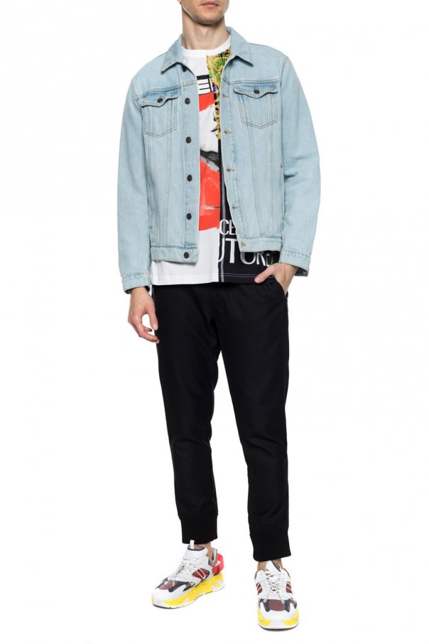 Black trousers from Versace Jeans Couture. Zip fly with snap closure. White branding at the waist. Elasticated cuffs. 2 zipped front pockets.
