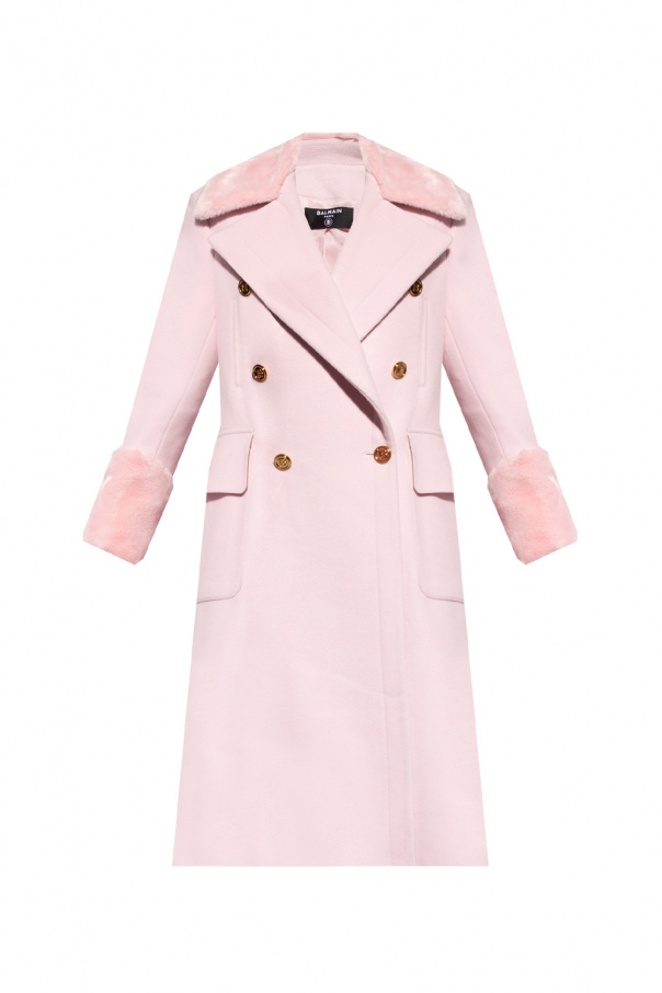 Light pink double-breasted coat with peak lapels from Balmain. Made of a wool and cashmere blend, this long sleeve design features metal logo-embossed buttons in gold-tone, two slip pockets, two flap pockets and a single rear vent.
